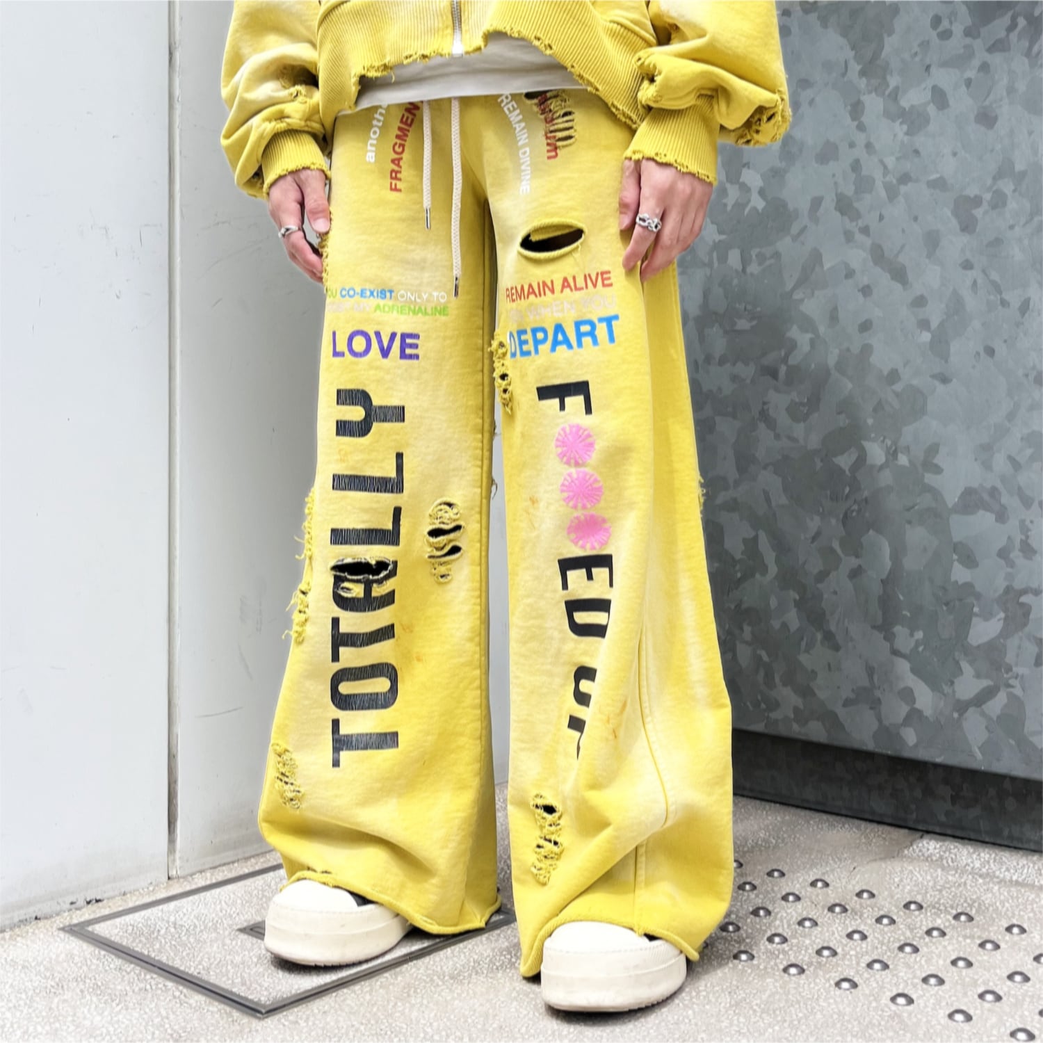 全体にダメージ加工とペンキによる汚し加工、フロントにはグラフィックデザイン、シンボルロゴは立体感のある発泡プリントで落とし込まれております。