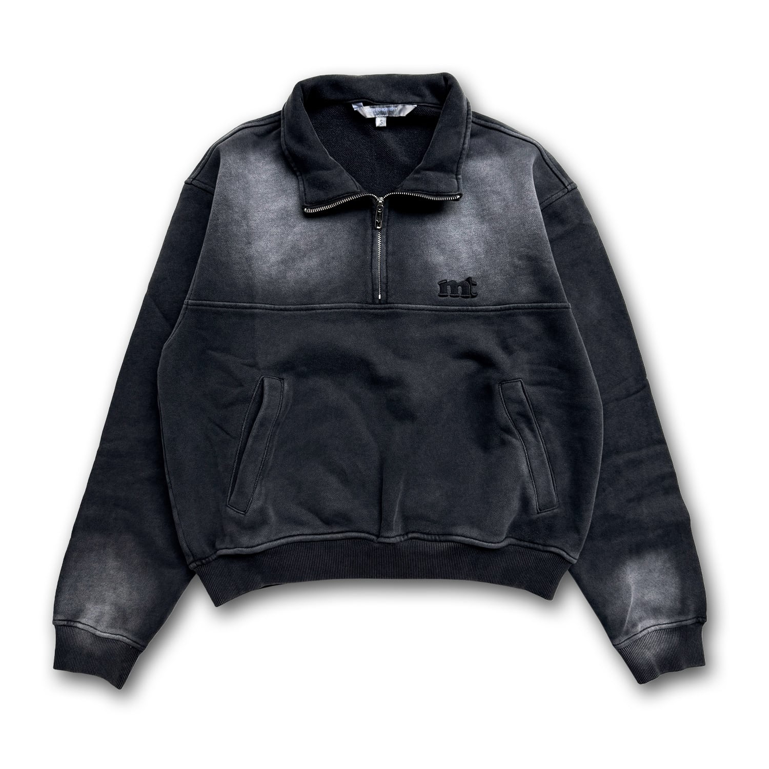 ヴィンテージのウォッシュ加工が施されたハーフジップスウェット。