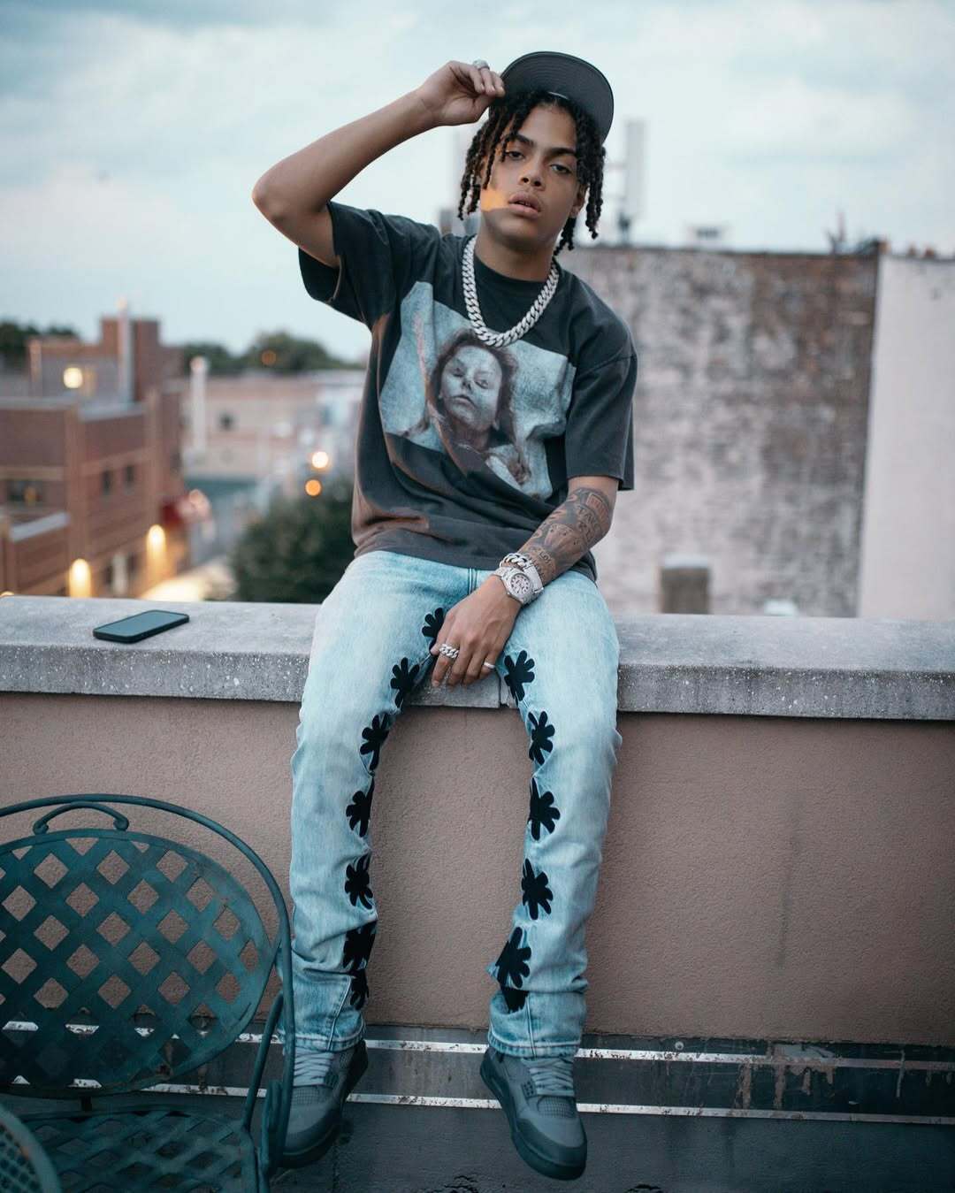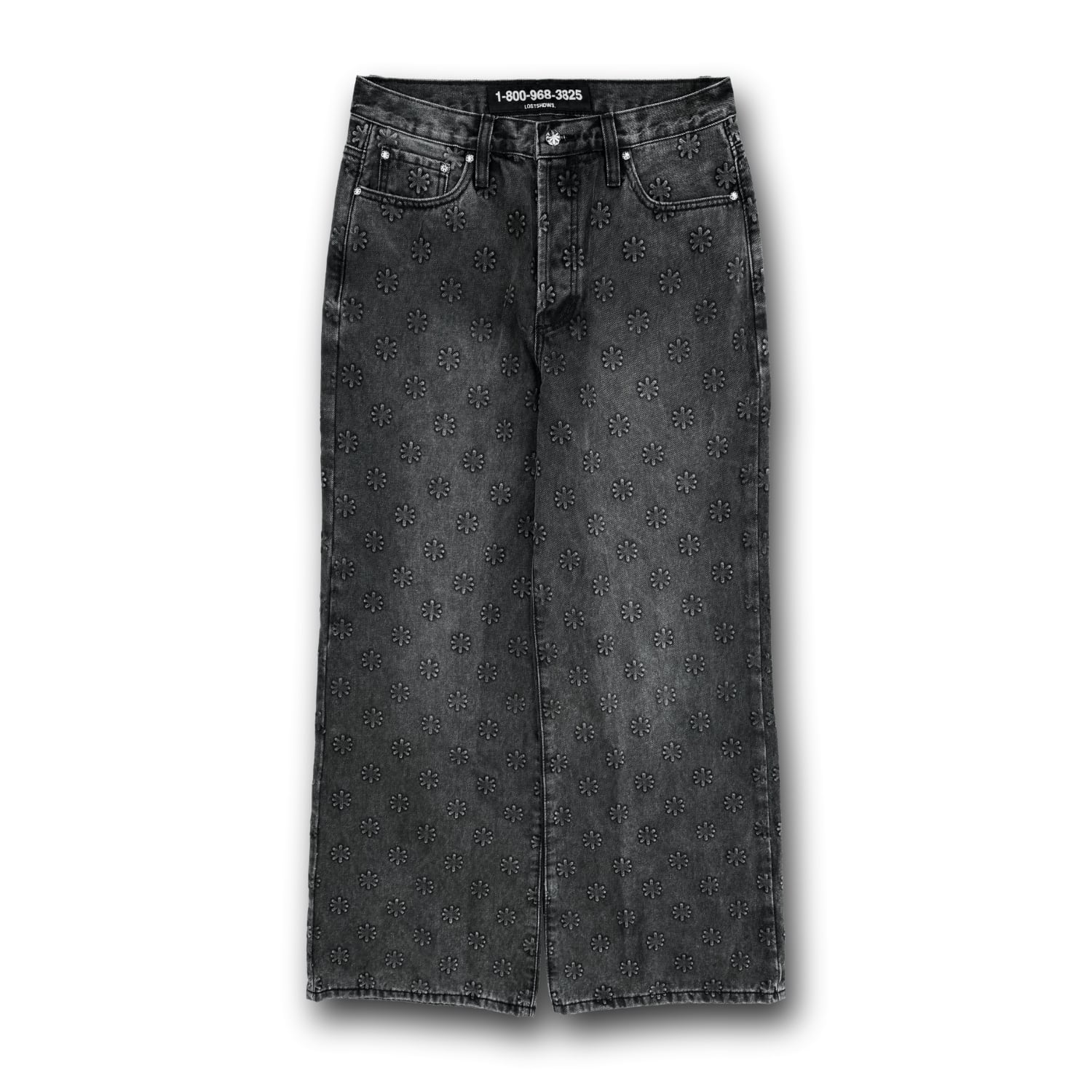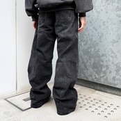 ウォッシュ加工が施されたバギーシルエットのデニムパンツ。